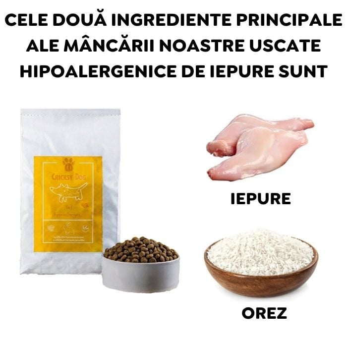 „Această hrană hipoalergenică are carnea de iepure ca principală sursă de proteine animale. Rețeta nu conține carne de pui sau gluten din grâu, astfel încât poate fi consumată cu încredere chiar și de câinii mai sensibili!