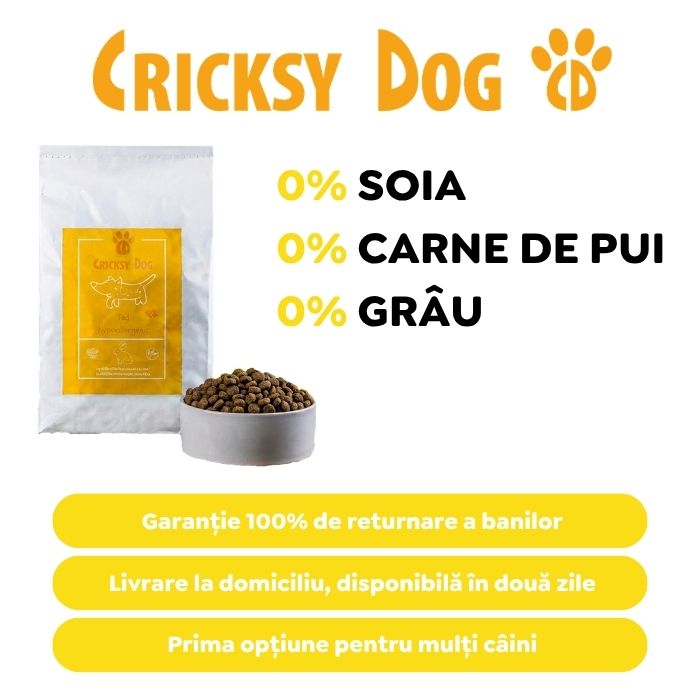 „Probabil ai auzit deja că mulți câini din Ungaria suferă de alergii alimentare și probleme dermatologice. În multe cazuri, alergia la pasăre – în special la carne de pui – este cauza principală. De aceea, rețetele hipoalergenice CricksyDog nu conțin carne de pui sau alte tipuri de carne de pasăre.